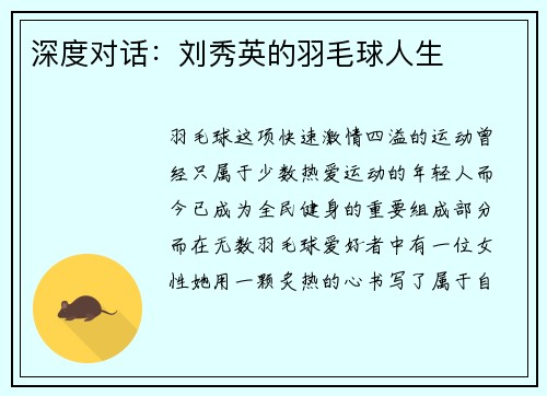 走进刘秀英的羽毛球世界,仿佛进入了一场精神的盛宴。这不仅仅是一位运动员的成长轨迹,更是一个关于坚持、激情和梦想的故事。在这个阶段,我们将深入探讨她的训练哲学、比赛经验、以及她对羽毛球运动未来的展望。